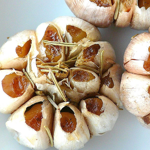 Preheat oven to 400Âş. Coat the outside of a whole or partial head of garlic with olive oil and place in an oven proof skillet or garlic roaster. Place in oven on lower rack and roast until the skin is brown and the garlic is tender---about 40-60 mins. Set aside to cool. Once cooled, use in recipes such as our Vegetarian Black Bean Chili, spread atop fresh french bread, or bake into deliciously stinky muffins!