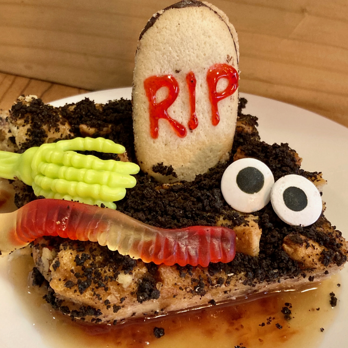 To create a boo-tiful graveyard atop your bread pudding, let the pudding cool slightly, then, liberally sprinkle a layer of 'dirt' made from grinding any chocolate cookies, like oreos, or other edible biscuits into fine crumbs.Â