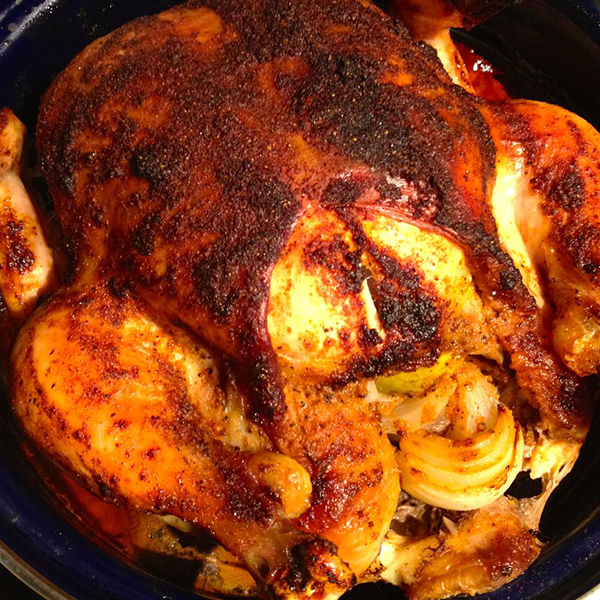 Remove from oven and lift bird tilting slightly to allow the liquids to empty into the roasting pan. (You can use these later for a delicious gravy.) Transfer the chicken to a platter and tent with foil to keep warm.