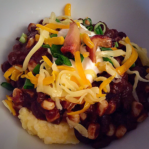 In large pot over high heat, sauté onions with garlic, butter & olive oil till brown and caramelized. About 20 mins. Add "The Original" and Chili Powder and cook for 1 min. Add the beans and water to pot making sure the beans are covered by 1 inch. Add the tomato paste, salt and pepper. Bring to a boil then simmer for about an hour, or until reduced and thickened. Stir in roasted minced garlic, corn and juice from the lemon, cook until hot --- another 5 min. Ladle into warm bowls over cheese grits and garnish with your favorite shredded cheese, a dollop of sour cream and a sprinkle of green onions! Or, spoon some on tortilla chips and cheese for nachos or on the side of another classic Mexican dish.